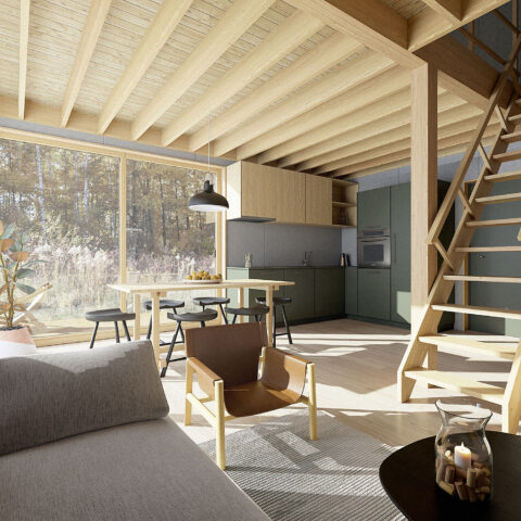 A modernist house with a clean, cubic body enriched by large glazing with a sliding terrace window. The building’s characteristic large glazing in the corner provides adequate lighting for the interior, while at the same time giving the impression that the surrounding nature penetrates inside. The building’s exceptionally large surface area offers many development possibilities, and the square-plan solution has allowed for a functional layout of the rooms. The building features an entrance area with a wardrobe, a spacious living room with kitchen and dining area, and a bathroom.