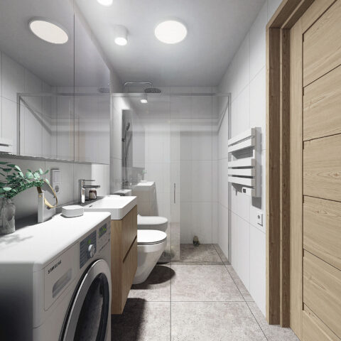 A subdued composition of floor tiles in a fashionable terrazzo pattern with a stone texture in the 60×60 format and light 30×60 wall tiles. An ideal solution for those who prefer more decisive designs. Light oak furniture. Radiator and electrical equipment in white.