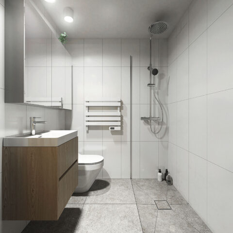 Electric capacity water heater in the bathroom. The package includes the installation of a single phase water heater with a comfort tank. The unit heats water for use in the kitchen as well as in the bathroom. It fits perfectly with the eco-friendly shower set with water aerator that we offer as part of the prefabricated bathroom. We recommend this option when electricity connection power is limited and especially when the building is to be equipped with a photovoltaic system.